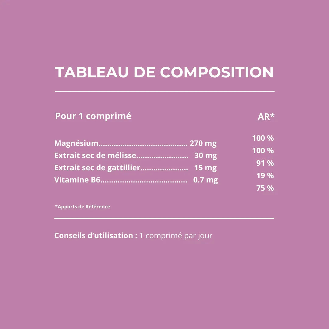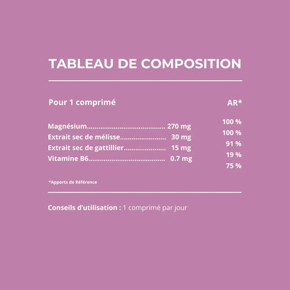 Ingrédients : Glycérophosphate de magnésium, oxyde de magnésium, tunique d'origine végétale : hypromellose, extrait sec de feuille de Mélisse sur maltodextrine (Melissae officinalis), extrait sec de fruit de Gattilier sur maltodextrine (Vitex agnus caltus) - stéarate de magnésium (anti-agglomérant), vitamine B6.